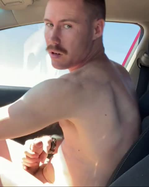 Hung guy jerks big cock in car